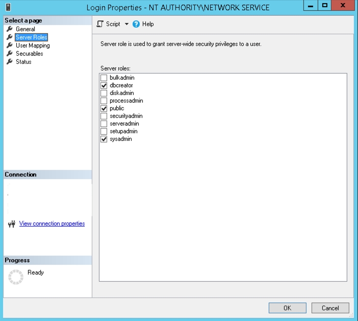 4. Open SQL Management Studio and connect. Expand Security > Logins, and right click on NETWORK SERVICE and select Properties. Then go to Server Roles and check the dbcreator role.